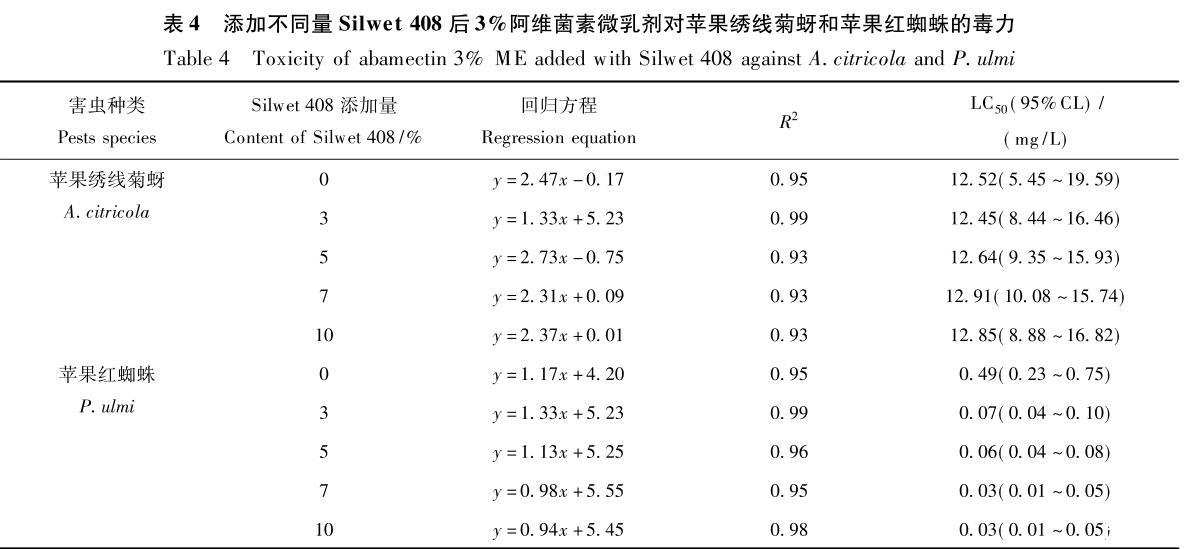 從表4中數(shù)據(jù)可看出:添加Silwet408可明顯提高阿維菌素微乳劑對蘋果紅蜘蛛的毒力,且隨助劑添加量的增加,藥劑LC50值降低;但添加Silwet408對阿維菌素微乳劑對蘋果繡線菊蚜的毒力并無明顯影響。說明Silwet408雖能降低藥液的表面張力及在靶標葉面的接觸角,促進藥液在葉片上的潤濕性,但并不一定能提高其對害蟲的毒力。