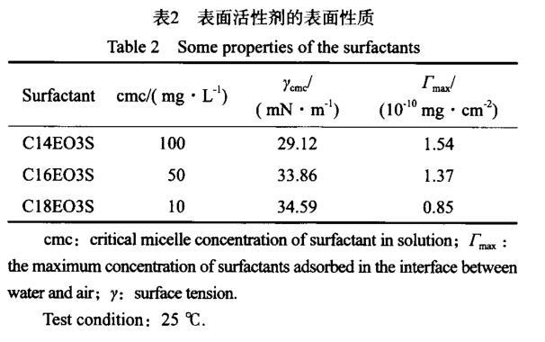 表面活性劑分子的結(jié)構(gòu)特點決定了其在水溶液界面(液-氣)上的吸附特性,其極性基團指向水、非極性基團則指向氣。應(yīng)用Gibbs公式可計算表面活性劑在單位溶液表面的最大飽和吸附量(Γmax),表面活性劑的表面性質(zhì)見表2。由表2可見,C14EO3S,C16EO3S,C18EO3S表面活性劑在蒸餾水中的cmc分別為100,50,10 mg/L,對應(yīng)的γcmc分別為29.12,33.86,34.59 mN/m。由此可見,表面活性劑在蒸餾水中的cmc隨疏水基鏈長的增加而降低。這是因為:一方面,脂肪醇聚氧乙烯醚磺酸鹽表面活性劑中含有親水的EO基團,其分子鏈呈鋸齒蜷曲形態(tài)排列,分子占據(jù)面積較大;另一方面,分子中的疏水基鏈長的增加,導致疏水基團的相互作用增強,對蜷曲的分子起到拉伸作用,同時會降低分子親水頭基面積,在這兩個相反作用中疏水基的相互吸引作用隨著疏水鏈長度的增加而明顯增強,使得表面活性劑分子排列更緊密,易于形成膠束。但cmc對應(yīng)的γcmc則隨疏水基鏈長的增加而略有增加。