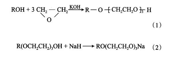 利用表面活性劑進行化學驅(qū)油可大幅提高原油采收率,主要原理在于表面活性劑能較大程度地降低油水界面張力。脂肪醇醚磺酸鹽表面活性劑為非離子-陰離子復合型表面活性劑,其分子結(jié)構(gòu)中含有脂肪族碳鏈疏水基,以及氧乙烯基團和磺酸基團兩種親水基,不僅兼具很好的抗溫和抗鹽能力,且表面活性高、配伍性好、生物降解性能好,可用作高礦化度及高溫油藏的化學驅(qū)油劑,具有廣泛的應(yīng)用前景。國內(nèi)外有關(guān)脂肪醇聚氧乙烯醚磺酸鹽類表面活性劑合成的研究報道較多,但對環(huán)氧乙烷(EO)數(shù)為3的脂肪醇醚磺酸鹽表面活性劑性能的研究較少。