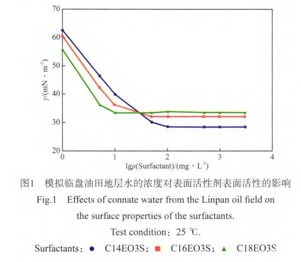使用模擬臨盤油田地層水將表面活性劑配制成溶液,考察油田地層水對表面活性劑表面活性的影響,實驗結(jié)果見圖1。由圖1可看出,在該油田地層水中,C14EO3S,C16EO3S,C18EO3S的cmc依次為80,40,10 mg/L,其所對應(yīng)的γcmc分別為28.86,32.38,33.75 mN/m。與C14EO3S在蒸餾水中的cmc相比,C14EO3S在油田地層水的cmc降低了20 mg/L。由文獻(xiàn)[1]的報道可知,在該油田地層水中,C14EO6S,C16EO6S,C18EO6S表面活性劑的cmc依次為100,50,50 mg/L,其所對應(yīng)的γcmc分別為29.14,36.74,34.65 mN/m。實驗結(jié)果表明,隨EO數(shù)的增加,脂肪醇聚氧乙烯醚磺酸鹽表面活性劑在油田地層水中的cmc和其所對應(yīng)的γcmc均有不同程度的增大。