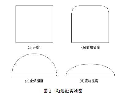 通過(guò)對(duì)釉料熔融實(shí)驗(yàn)的觀察可以看到,隨著溫度升高,低共融物產(chǎn)生,試樣出現(xiàn)液相,逐漸變?yōu)槿垠w。四棱柱試樣最先變形的部位為頂部角點(diǎn)。由于角點(diǎn)是四棱柱曲率最大的部位(7/8的表面與空氣接觸),表面張力最大,表面能高,由表面張力產(chǎn)生的指向熔體內(nèi)部的附加壓力也最大,因此角點(diǎn)最先熔融變圓,此時(shí)試樣所處的溫度(1180℃),稱為釉的始熔溫度,釉層開始封閉,如圖2b所示。隨著溫度繼續(xù)升高,四棱柱的棱邊也開始熔融變圓,棱邊也是曲率較大的部位(3/4的表面與空氣接觸)。最后,四棱體的各個(gè)平面開始熔融變圓(1/2的表面與空氣接觸),整個(gè)試樣由于表面張力的作用變?yōu)榘肭驙?,此時(shí)的溫度(1260℃)稱為全熔溫度,如圖2c所示,形成平整、光滑的釉面。釉層雖然處于黏性流動(dòng)狀態(tài),但黏度較大不至于流淌,因此接近于釉的成熟溫度。溫度繼續(xù)升高,試樣流散開來(lái),高度降至原有高度的1/3時(shí)的溫度(1300℃)稱為流動(dòng)溫度,見圖2d。此時(shí)由于溫度升高,熔體表面張力減小,同時(shí)釉熔體黏度降低,受重力作用熔體會(huì)產(chǎn)生自然流淌,熔體表面由球面變?yōu)闄E球面。