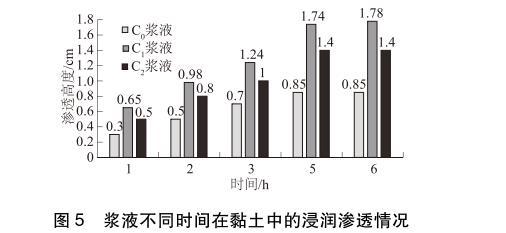 從圖5的試驗結果可知:3種漿液在開始滲透后的3h內(nèi)浸潤滲透速度相對較快,3~5h之間,浸潤滲透速度相對變慢,5h后浸潤滲透高度趨于穩(wěn)定。在相同時間內(nèi),漿液在黏土中的浸潤滲透高度C1>C2>C0。滲透穩(wěn)定后,C1、C2漿液在黏土中的浸潤滲透高度比C0漿液的浸潤滲透高度分別提高了109.4%和64.7%,說明表面活性劑可以提高漿液的滲透性,且表面活性劑S1提高漿液滲透性的幅度更大。
