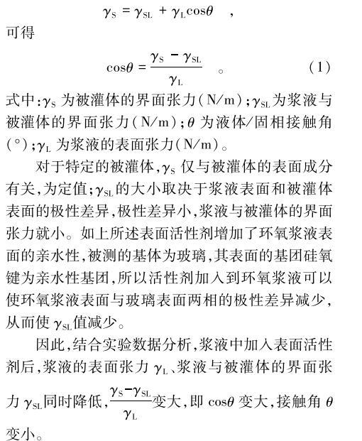 對于特定的被灌體,γS僅與被灌體的表面成分有關,為定值;γSL的大小取決于漿液表面和被灌體表面的極性差異,極性差異小,漿液與被灌體的界面張力就小。如上所述表面活性劑增加了環(huán)氧漿液表面的親水性,被測的基體為玻璃,其表面的基團硅氧鍵為親水性基團,所以活性劑加入到環(huán)氧漿液可以使環(huán)氧漿液表面與玻璃表面兩相的極性差異減少,從而使γSL值減少。