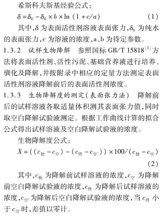 降解前后的試樣溶液各取適量體積測其表面張力值,同時取空白降解試驗液測定。根據(jù)工作曲線計算的擬合公式得出試樣溶液及空白降解試驗液的濃度。