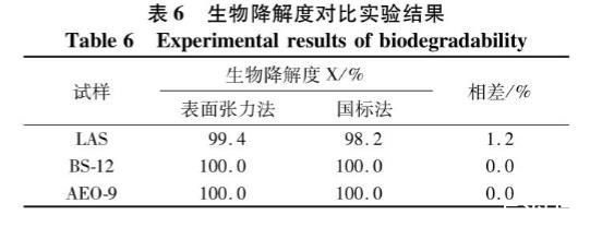 對比兩種方法得出的生物降解度,由表6可知,表面張力法計算得出的生物降解度比國標法測定的結(jié)果偏高或者一致,兩者相差小于2%,可認為兩種方法均可測定表面活性劑的生物降解度,其結(jié)果均可信。