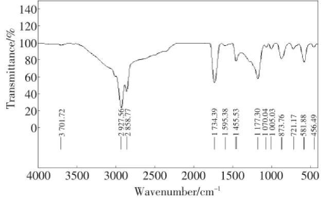 將菌株147產(chǎn)物提純,紅外光譜儀(FT-IR)分析物質(zhì)結(jié)構(gòu),結(jié)果如圖2。該物質(zhì)在3701.72cm-1處有吸收峰,表明分子中有羥基存在;2 858.77~2 927.56 cm-1處的吸收峰表明存在糖類C-H的伸縮振動,1400~1200 cm-1處是C-H變角振動,1 734.39 cm-1處是C=O的雙鍵振動,而1 070.04 cm-1處為C-O-C鍵伸縮振動,因此該物質(zhì)中有一個五元環(huán)狀內(nèi)酯和糖苷鍵存在。由此進一步證明該生物表面活性劑含糖脂類物質(zhì)。