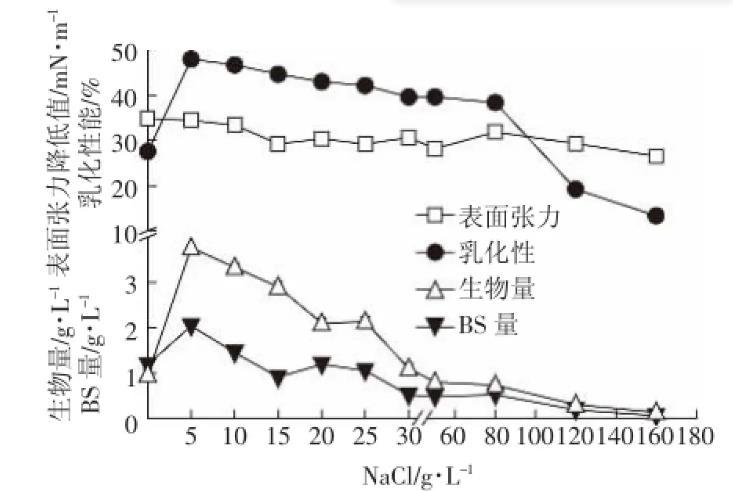 NaCl濃度通過改變細(xì)胞滲透壓影響微生物的生長與代謝,從而影響發(fā)酵產(chǎn)物的產(chǎn)量。由圖6可見,鹽濃度在0~5 g·L-1之間,細(xì)菌生長受到促進(jìn),而當(dāng)鹽濃度大于5 g·L-1時(shí),細(xì)菌的生長受到抑制,糖脂量與生物量趨勢(shì)一致。菌株的生物量、生物表面活性劑量、表面張力值與乳化性均在鹽濃度為5 g·L-1時(shí)呈現(xiàn)最大,說明該菌株具有一定的耐鹽性,與強(qiáng)婧等研究的生物表面活性劑產(chǎn)生菌Pseudomonas aeruginosa S6也能夠耐鹽相似。此外,本菌株在最高為25 g·L-1的鹽濃度條件下依然能夠存活,但此時(shí)已不能產(chǎn)生更多的生物表面活性劑。