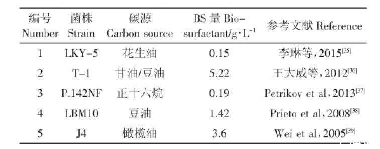 最佳培養(yǎng)條件下,本實(shí)驗(yàn)細(xì)菌生物量最高能達(dá)到5.22 g·L-1(表6),生物表面活性劑量達(dá)到5.09 g·L-1。相對(duì)已報(bào)道的幾株銅綠假單胞菌(Pseudomonas aeruginosa)合成生物表面活性劑的產(chǎn)率在2.12~15.92 g·L-1范圍內(nèi),本菌株的產(chǎn)表面活性劑能力居中。