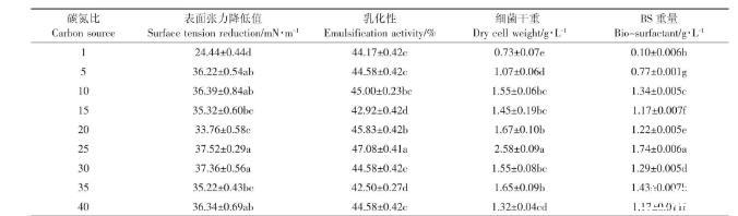 表5碳氮比對(duì)147細(xì)菌生長以及生物表面活性劑產(chǎn)量的影響