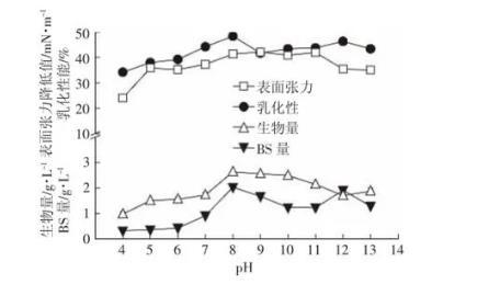 圖5 pH對(duì)147細(xì)菌生長以及生物表面活性劑產(chǎn)量的影響