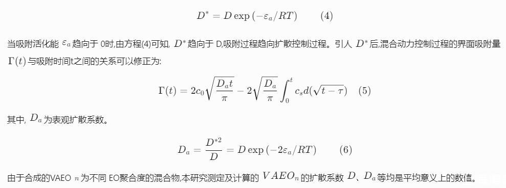 擴散控制的吸附過程,表面活性劑分子由濃度差驅(qū)使進入新表面,不存在吸附勢壘。Word-Tordai方程描述了界面吸附量Г(t)與吸附時間t的關(guān)系:Г(t)=2c0Dtπ-2Dπ∫t0csd(t-τ)(1)式中,c0是溶液本體表面活性劑濃度,mol/L,D是單分子擴散系數(shù),m2/s,cs是次表面表面活性劑濃度,mol/L,τ是整合虛設(shè)變量。方程(1)不能直接求解,可通過極限法求解。在t→0時,表面張力γ(t)近似于溶劑表面張力γ0,表面吸附接近平衡時,γ(t)近似于靜態(tài)表面張力γeq.Fainerman等用漸近的方法對方程(1)進行轉(zhuǎn)化:γ(t→0)=γ0-2nRTc0Dtπ(2)γ(t→∞)=γeq+nRTГ2eqcπ4Dt(3)方程(3)中,t→∞時,c=c0,Γeq表示靜態(tài)表面張力達到平衡時的表面吸附量?;旌蟿恿U散吸附是指表面活性劑分子從本體擴散到次表面仍然遵循擴散機理,但從次表面層擴散到表面層時需克服一定的勢壘。Liggieri和Ravera[15,16]提出,次表面層中的分子,只有能量大于吸附活化能εa才能被吸附到表面,已吸附的分子,只有能量大于解吸活化能εb才能被解吸。以Word-Tordai方程為基礎(chǔ),引入矯正擴散系數(shù)D?。矯正擴散系數(shù)D?和擴散系數(shù)D關(guān)系定義為:D?=Dexp(——εa/RT)(4)當(dāng)吸附活化能εa趨向于0時,由方程(4)可知,D?趨向于D,吸附過程趨向擴散控制過程。引入D?后,混合動力控制過程的界面吸附量Г(t)與吸附時間t之間的關(guān)系可以修正為:Г(t)=2c0Datπ-2Daπ∫t0csd(t-τ)(5)其中,Da為表觀擴散系數(shù)。Da=D?2D=Dexp(——2εa/RT)(6)由于合成的VAEOn為不同EO聚合度的混合物,本研究測定及計算的VAEOn的擴散系數(shù)D、Da等均是平均意義上的數(shù)值。