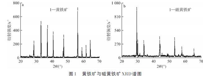 由圖1可知:試驗所用黃鐵礦與磁黃鐵礦純度較高,均達到90%以上,雜峰很少,符合試驗要求,可以用作后續(xù)試驗研究。