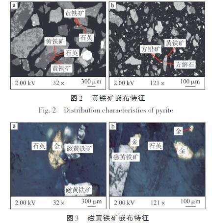 由圖3可知:磁黃鐵礦在礦石中主要以嵌布形式存在,主要嵌布于脈石礦物粒間,少量嵌布在脈石礦物裂隙中。嵌布于脈石礦物粒間的磁黃鐵礦粒度以大于0.037 mm為主,而嵌布在脈石礦物裂隙中的磁黃鐵礦多呈細脈狀構造產(chǎn)出。常見金礦物與磁黃鐵礦連晶嵌布于脈石礦物粒間,這表明磁黃鐵礦與金礦物之間存在密切的關系,磁黃鐵礦同樣是主要載金礦物。