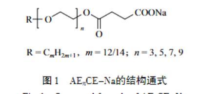 表面活性劑是一類應(yīng)用廣泛的有機(jī)化合物,極少的用量就能顯著提高溶液的性能,因此,表面活性劑的研究具有重要的現(xiàn)實(shí)和理論意義。其中,陰離子和非離子型表面活性劑的用量最多且應(yīng)用最為廣泛,它們具有優(yōu)異的去污性、水溶性、耐熱性、耐鹽性及制備成本低和環(huán)境友好等優(yōu)點(diǎn)。然而,傳統(tǒng)的表面活性劑分子通常只包含一個親水頭基和一個疏水尾鏈,很難同時具有陰離子和非離子表面活性劑的特性。值得一提的是,脂肪醇醚琥珀酸酯鹽(AEnCE-Na,n=3,5,7,9)是一種新型的表面活性劑,結(jié)構(gòu)通式如圖1所示。結(jié)構(gòu)決定性質(zhì),因此,可以推斷AEnCE-Na具有許多優(yōu)異的性能:1)一個分子中同時存在兩個親水基團(tuán)(EO鏈和陰離子頭基)和一個疏水基團(tuán)(烷基碳鏈),使其具有優(yōu)異的表面活性、乳化性和發(fā)泡性;2)分子中的酯基在水解后可形成具有優(yōu)異生物降解性的非離子表面活性劑和鹽,因此,該類表面活性劑安全且環(huán)保,符合當(dāng)代“綠色化”的發(fā)展理念;3)直鏈表面活性劑比支鏈表面活性劑具有更好的自降解能力。然而,目前對于脂肪醇醚琥珀酸酯鹽表面活性劑的研究甚少。