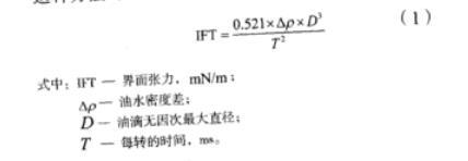 采用芬蘭Kibron dIFT雙通道動態(tài)界面張力儀進(jìn)行界面張力測定。此張力儀的原理是:液滴通過旋轉(zhuǎn)處于一定的離心場中,這時兩種液體之間的界面張力及旋轉(zhuǎn)的速度就決定了液滴的形狀,液滴的平衡形狀通過調(diào)整轉(zhuǎn)速得到改變,而使液滴以一定的角速度自轉(zhuǎn),這時通過離心力、重力以及界面張力的三種力量的共同作用下,在高密度的液體中,低密度的液滴能夠形成圓柱形或長橢球形液滴。這種方法可以測定出10-6mN/m的超低界面張力。