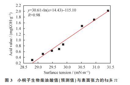 (2)通過氧化實驗得到的小桐子生物柴油的酸值與表面張力相關(guān)系數(shù)為0.99,表明可用表面張力預(yù)測酸值;比較4種預(yù)測模型的精度分析結(jié)果,確定對數(shù)模型(y=30.61x ln(x+14.43)-115.10)精度最高,其預(yù)測均方根誤差REMSP值及相關(guān)系數(shù)R分別為0.0937和0.9879,酸值預(yù)測值與真實值誤差為2.95%。