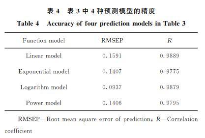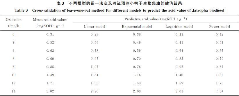 留一法交叉驗證是建立預(yù)測模型的一種常用方法,從N個觀測數(shù)據(jù)中選擇一個觀測數(shù)據(jù)作為驗證數(shù)據(jù),然后使用剩下的(N-1)個觀測數(shù)據(jù)擬合一個模型,并用驗證數(shù)據(jù)來驗證模型的精度,如此重復(fù)N次??紤]到數(shù)據(jù)量以及相關(guān)性,筆者利用Excel建立了線性、指數(shù)、對數(shù)、乘冪4種預(yù)測模型,對小桐子生物柴油酸值的預(yù)測結(jié)果見表3。