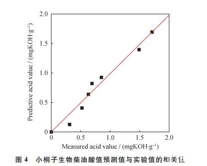 圖4為小桐子生物柴油的酸值實驗值與對數(shù)模型預(yù)測值的函數(shù)關(guān)系: