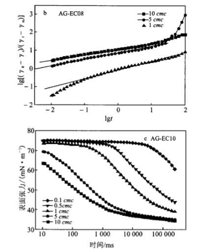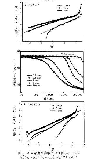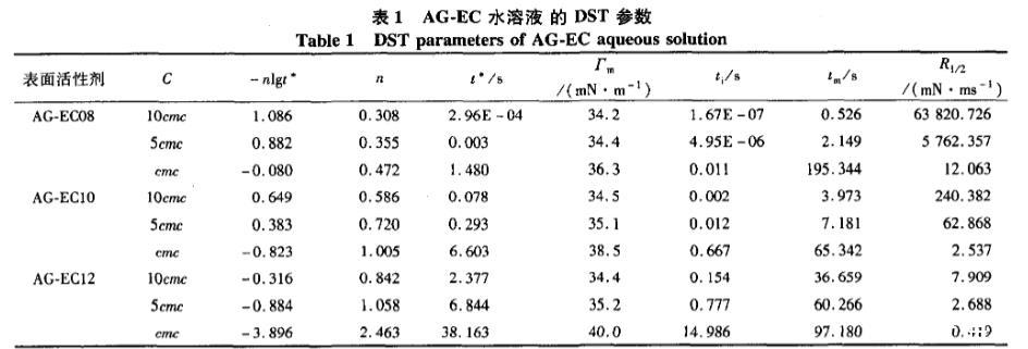 在25cc下測(cè)定不同濃度AG.EC水溶液的DST,并利用Rosen模型處理,得到其動(dòng)態(tài)表面張力參數(shù),見(jiàn)圖4、表1。