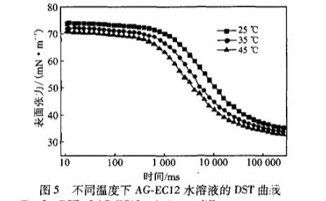 由圖5可知,當(dāng)溫度升高,DST下降的速率明顯加快。這是因?yàn)榉肿拥牟灰?guī)則運(yùn)動(dòng)更加激烈,使得分子間的引力減小。表面張力越早開(kāi)始下降,在各個(gè)階段的表面張力值就越低。在45℃下開(kāi)始測(cè)量時(shí),表面張力已經(jīng)降到了70mN/m左右,這也許是由于溫度升高降低了純?nèi)軇┧谋砻鎻埩ΑI邷囟?,表面張力下降的更快,更易達(dá)到第四個(gè)階段平衡狀態(tài)。這說(shuō)明了高溫下其動(dòng)態(tài)表面活性更好。可能是由于表面活化能在高溫時(shí)更低,使得AG.EC分子更易在溶液表面吸附。
