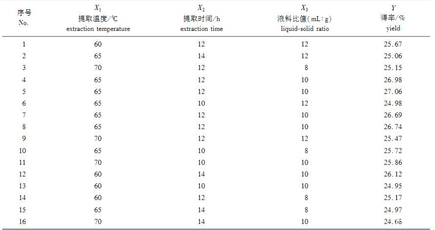通過軟件分析得到肥皂莢皂苷的最優(yōu)提取條件為:溫度69.20℃、時間11.28 h、液料比值9.89,皂苷得率的預(yù)測值為26.44%。為了操作方便,修正提取條件為:溫度69℃、時間11 h 15 min、液料比值為10。在此條件下對肥皂莢皂苷進行水浸提,并做3次重復(fù)性實驗,平均得率為26.49%,與理論值誤差僅為0.05%。表明該模型可以較好地預(yù)測肥皂莢皂苷的提取工藝。