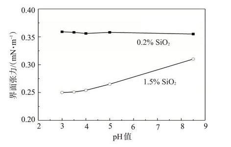 當(dāng)SiO2質(zhì)量分?jǐn)?shù)為1.5%時(shí),納米SiO2/SDS體系靜置不久納米SiO2即聚集在一起,使得SiO2與SDS之間的排斥作用減小,隨著pH值的降低,水化作用力及H+保護(hù)層的形成使得納米SiO2聚集的幾率大大降低,SiO2顆粒在體系中分散較均勻,因此SiO2與SDS之間的排斥作用增大,體系降低油水界面張力的能力增強(qiáng)。當(dāng)SiO2質(zhì)量分?jǐn)?shù)為0.2%時(shí),納米SiO2/SDS體系具有較好的穩(wěn)定性,pH值的下降對(duì)體系降低油水界面張力的能力基本無影響。