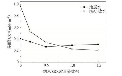 在NaCl鹽水中,納米SiO2/SDS體系的|ζ|基本大于30 mV,體系更易穩(wěn)定;模擬地層水中二價(jià)陽離子的存在使得體系的|ζ|均小于30 mV,顆粒容易聚集沉淀。納米SiO2含量越大,顆粒之間碰撞的機(jī)率增加,納米SiO2/SDS體系的穩(wěn)定性越差。隨著納米SiO2含量的增加,SDS降低油水界面張力的能力在NaCl鹽水中逐漸增強(qiáng),而在模擬地層水中先增后減,在SiO2質(zhì)量分?jǐn)?shù)為0.5%時(shí)界面張力達(dá)到最低。
