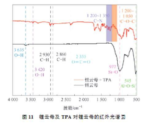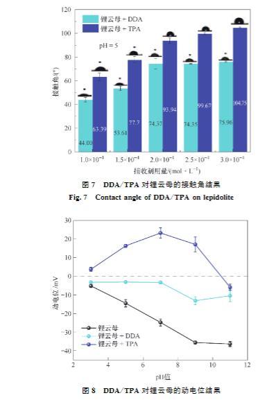 (2)接觸角試驗表明,同等條件下,TPA作用鋰云母的接觸角總是大于DDA,展現(xiàn)了TPA更強的疏水性。Zeta電位測試結(jié)果表明,TPA及DDA在鋰云母表面的吸附為靜電吸附,并且碳鏈更長的TPA由于疏水效應吸附性更好,進一步證明了TPA的強疏水性。FTIR及XPS進一步證實了TPA吸附在鋰云母表面。