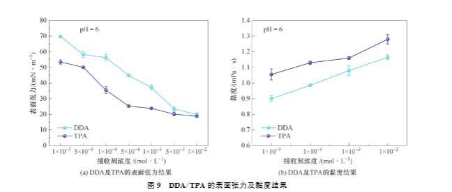 DDA及TPA的黏度結(jié)果如圖9(b)所示。由圖9(b)可知,弱酸性條件下,DDA或TPA的黏度均隨著捕收劑用量的增加而增大,這說明DDA或TPA均能增強溶液黏度。當捕收劑濃度一致時,TPA的黏度總是大于DDA,這說明較高黏度的TPA具有更穩(wěn)定