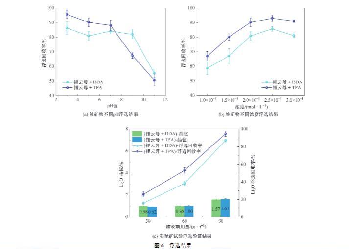 實際礦浮選試驗的檢測結(jié)果如圖6(c)所示,可以看出,在較小的捕收劑用量下,TPA或DDA作用后鋰云母精礦的品位相接近。但是,較高的產(chǎn)率使得TPA對鋰云母的浮選回收率高于DDA。實際礦檢測結(jié)果進一步證明TPA浮選性能的優(yōu)越。此外,隨著藥劑用量的加大,DDA或TPA作用鋰云母的品位與回收率均會相應提高。
