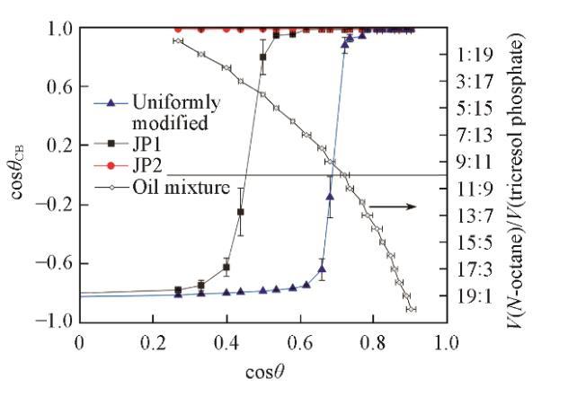 放置在靜止液體表面的顆粒的潤濕行為由圖5示出。隨著液體表面張力的增加,從光滑的氟碳鏈覆蓋的表面獲得的cosθ值同時增大,液體頂部的表面出現(xiàn)明顯的不溶顆粒。這種顆粒不潤濕的情況與顆粒形成粗糙表面測量的結(jié)果具有相關性。干燥的顆粒以蓬松狀態(tài)直接向油相傾倒,如果在油相表面能形成足夠強壯的、由顆粒組成的亞穩(wěn)態(tài)Cassie-Baxter狀態(tài),那么疏油表面將會形成,并阻止其它顆粒接觸油相,宏觀表現(xiàn)為顆粒不潤濕。相反,如果油相表面由顆粒組成的亞穩(wěn)態(tài)Cassie-Baxter狀態(tài)魯棒性不足,在手動振蕩或重力作用下,顆?;蝾w粒團聚體接觸油相并浸沒在油相中。亞穩(wěn)態(tài)魯棒性與顆粒表面材料潤濕角密切相關,即不同類型的顆粒具有明顯不同的潤濕轉(zhuǎn)折點。JP1潤濕性轉(zhuǎn)折點位于均勻修飾顆粒右側(cè),JP2沒有發(fā)現(xiàn)潤濕轉(zhuǎn)折點。這與顆粒上接枝的烷烴鏈數(shù)量有關。JP2上盡管存在氟碳鏈,但由于烷烴鏈覆蓋的面積太大,使顆粒整體表現(xiàn)出強烈的親油性。