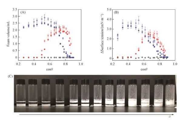 然而,顆粒在超聲波的作用下依舊產(chǎn)生了泡沫。這是由于顆粒數(shù)量多,顆粒團聚體尺寸變得十分巨大,并出現(xiàn)明顯沉淀。超聲波無法把這些團聚體完全破壞。受超聲波作用,團聚體被分散成更小的狀態(tài),但依舊有十分明顯的沉淀。在用手劇烈振蕩之后,無論顆粒是否被超聲波處理過,均有機會重新形成更大的、肉眼可見的團聚體[圖7(B)],這說明顆粒團聚體是產(chǎn)生泡沫的關鍵。結(jié)合圖4和圖6結(jié)果,以粗糙表面代表的顆粒團聚體表面接觸角在θ_CB為90°(cosθ_CB=0)附近具有最多的泡沫體積和最大的表面張力降低值,而對應的θ均小于70.1°(cosθ > 0.39),這表明顆粒在油氣表面上吸附并起泡需要顆粒團聚體的Cassie-Baxter復合表面的接觸角θ_CB約為90°,而對應的顆粒的本征接觸角θ則小于70.1°,不需要單個顆粒潤濕角必須接近90°。