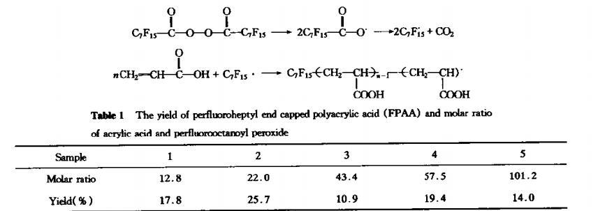 聚合反應(yīng)是在溶劑CF_{2}CICF CI_{2}中進行的,大自由基將進行鏈轉(zhuǎn)移,單基或雙基終止反應(yīng),從而得出產(chǎn)物。反應(yīng)步驟為在-17℃溫度下將50mL含有預(yù)定摩爾的全氟庚雙酰過氧化物的CF?CICFCI?溶液加入有氮氣保護裝置的反應(yīng)器中,攪拌下加入已精制過的丙烯酸(密度1.0511g/mL),加熱并恒溫在45℃下反應(yīng)10h,產(chǎn)物通過甲醇-乙酸乙酯溶劑體系重結(jié)晶并置真空烘箱中干燥,稱重并計算產(chǎn)率(如表1)。