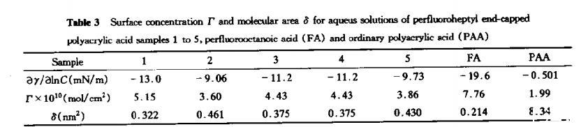 由表3可見,聚丙烯酸(分子量2.5x10?)在水溶液中界面活性極低(數(shù)據(jù)引自文獻),每個PAA分子對空氣-水界面的覆蓋十分松散,全氟庚酸分子所占約0.21nm2,接近全氟烷烴緊密排列的分子軸截面積,而FPAA每個分子所占據(jù)的表面面積在0.32~0.46nm2之間,形成尾形鏈構(gòu)象的刷狀結(jié)構(gòu)。全氟端基的引入,顯著改變了PAA分子在界面的構(gòu)象,由于全氟烴的憎水特性,在水溶液中趨于向水空氣界面的吸附,從而極大的提高了界面活性,降低了界面能。