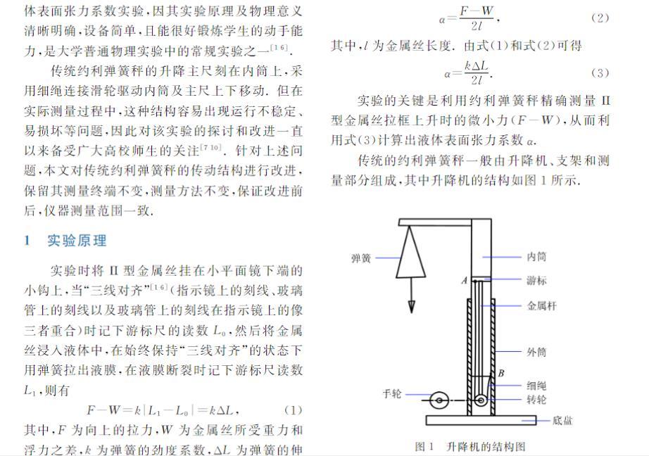 約利彈簧秤是一種精細彈簧秤,常用來測定微小的力。利用約利彈簧秤采用拉脫法測量液體表面張力系數實驗,因其實驗原理及物理意義清晰明確,設備簡單,且能很好鍛煉學生的動手能力,是大學普通物理實驗中的常規(guī)實驗之一。