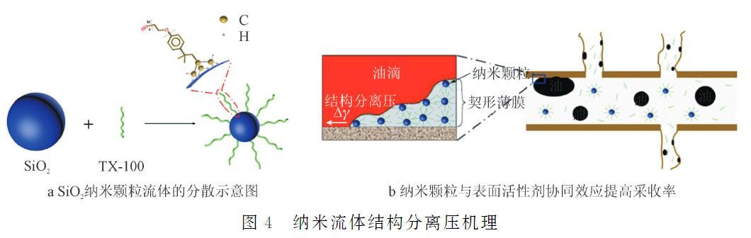 WasanD等提出的“結(jié)構(gòu)分離壓”理論,解釋了納米流體在油-固界面時這種壓力作用將油膜或油滴從巖石表面分離的過程。通過進(jìn)一步的研究發(fā)現(xiàn),這種結(jié)構(gòu)分離壓力的大小和速度受到納米顆粒濃度和液滴體積的影響。ZHAO等以非離子表面活性劑(TX-100)作為分散劑和增效劑,將SiO2納米顆粒分散在水中形成SiO2納米流體(如圖4a所示),并對SiO2納米流體剝離固體表面油滴的能力進(jìn)行了探究。SiO2納米流體和表面活性劑(TX-100)均具有將油滴從巖石表面脫離的能力。與表面活性劑(TX-100)相比,當(dāng)添加SiO2納米顆粒時,納米流體可以在油/固體/納米流體三相接觸區(qū)形成薄膜從而產(chǎn)生結(jié)構(gòu)分離壓,將油滴從巖石表面剝離。由于表面活性劑天然剝離油滴的能力和SiO2納米顆粒的結(jié)構(gòu)分離壓力機(jī)理(如圖4b所示),SiO2納米流體具有優(yōu)秀的滲吸提高采收率能力。