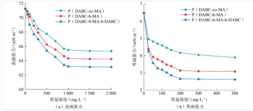 結(jié)果表明,所有共聚物均能有效降低表界面張力,具備兩親性。但嵌段共聚物,特別是三嵌段結(jié)構(gòu),降低張力的能力和效率顯著優(yōu)于無規(guī)共聚物。