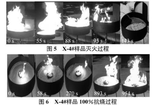 X-4#樣品泡沫具有高泡沫穩(wěn)定性,在以下研究中,著重研究X-4#與X-0#、3%AFFF相比的滅火及抗燒性能,測得的滅火時(shí)間及100%抗燒時(shí)間見表6。根據(jù)GB 15308—2006規(guī)定,滅火時(shí)間小于180 s,抗燒時(shí)間高于600s的泡沫被認(rèn)為具有成為消防泡沫滅火劑的潛力,X-4#樣品滅火時(shí)間88s、抗燒時(shí)間954 s,抗燒時(shí)間優(yōu)于3%AFFF,滅火時(shí)間比3%AFFF略高,但滿足消防用泡沫滅火劑性能要求,具有良好的消防滅火應(yīng)用潛力。