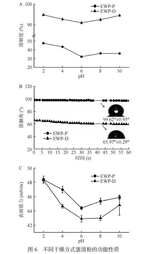 溶解性是蛋白重要的功能特性之一,與接觸角、表面張力、乳化性等密切相關(guān)。如圖6A,不同pH下不同干燥方式的蛋清粉溶解度的測(cè)量。EWP-P的溶解度隨著pH的升高先減小后增大,這可能是因?yàn)樵谒嵝院蛪A性環(huán)境中球狀蛋白質(zhì)會(huì)發(fā)生部分展開,形成熔融球狀構(gòu)象,變得更加靈活,更容易與水分子作用。pH為6.0時(shí)蛋清蛋白的溶解度最低,可能是因?yàn)樵損H與蛋清蛋白中大部分蛋白的等電點(diǎn)相近,蛋白帶電荷量較少,因此容易發(fā)生沉淀。與EWP-P相比,EWP-D在pH6.0時(shí)溶解度的下降程度較小,這可能與真空冷凍干燥后蛋清蛋白的微觀結(jié)構(gòu)呈片狀,具有較大的比表面積有關(guān),也可能是因?yàn)槔鋬龈稍锏鞍踪|(zhì)在脫水過程中蛋白質(zhì)變性低,促進(jìn)了可溶性聚集物生成。EWP-D的溶解度遠(yuǎn)大于EWP-P,這是因?yàn)閲婌F干燥是直接將蛋清液霧化后再干燥,其蛋清粉表面會(huì)形成一個(gè)光滑、抗?jié)裥缘谋∧?,最終導(dǎo)致蛋白的溶解性降低,復(fù)水性差且易結(jié)塊。而真空冷凍干燥經(jīng)過冷凍升華,可保持食品原有的形狀故具有很好的速溶性和復(fù)水性。Shaviklo等也發(fā)現(xiàn)噴霧干燥的含添加劑(花粉)蛋白的蛋白質(zhì)溶解度明顯低于凍干蛋白。