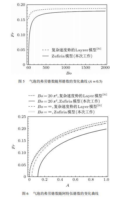 當(dāng)取邦德數(shù)一定時(shí),氣泡的弗勞德數(shù)隨阿特伍德數(shù)的變化如圖3所示。在圖3中Bo=20pi^2。從圖中可以發(fā)現(xiàn),利用Goncharov所提出的復(fù)雜速度勢運(yùn)算的結(jié)果比本次工作稍微大一些。在阿特伍德數(shù)等于1時(shí),兩種理論結(jié)果完全一致。當(dāng)阿特伍德數(shù)較小時(shí),兩種理論結(jié)果也基本一致。
