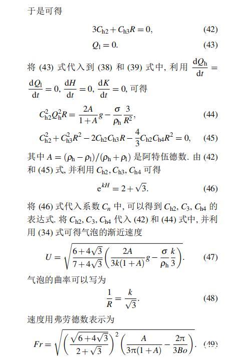 本文將簡單速度勢的Layzer模型和Zufiria模型推廣至非理想流體,并利用兩種模型考慮了界面張力的影響。分別得出了利用簡單速度勢的Layzer模型和Zufiria模型在考慮界面張力情況下Rayleigh-Taylor不穩(wěn)定性非線性演化后期氣泡的漸近解和曲率半徑的解析表達(dá)式。定量分析了模型之間的差別。結(jié)果表明:界面張力壓低了氣泡的漸近速度,但卻對(duì)氣泡的曲率沒有影響。在考慮界面張力的情況下,簡單速度勢的Layzer模型比復(fù)雜速度勢的Layzer模型給出的漸近速度小,但在阿特伍德數(shù)趨于1時(shí),兩種模型的結(jié)果一致;Zufiria模型的結(jié)果始終小于Layzer模型。