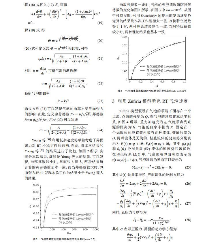 RT不穩(wěn)定性大致可以分為三個(gè)階段:早期線性增長階段、非線性增長階段和湍流混合階段。在早期階段,微擾振幅增長率呈指數(shù)增長,這一點(diǎn)人們已經(jīng)達(dá)成共識(shí)。當(dāng)微擾振幅和波長可以比擬時(shí),非線性發(fā)生,此時(shí)重流體以尖釘?shù)男问皆谳p流體中演化,而輕流體則以氣泡的形式在重流體中上升。在非線性增長的后期,氣泡和尖釘則是以恒定的速度增長。為了描述這一階段的演化,歷史上曾出現(xiàn)兩種主要的理論模型,一種是Layzer模型,另一種是Zufiria模型。1955年Layzer建立了適用于氣泡頂端附近的勢流模型,被稱之為Layzer模型。Zhang后來對(duì)該模型的速度勢進(jìn)行了修改。Goncharov、Sohn等人分別提出了新的速度勢,將Layzer模型推廣并應(yīng)用于任意密度比情形。1988年Zufiria提出了另一種理論模型,該模型假想在氣泡的下面存在一個(gè)點(diǎn)源,又稱點(diǎn)源模型。Zufiria模型的速度勢是復(fù)數(shù),而Layzer模型的速度勢是實(shí)數(shù)。Zufiria模型的運(yùn)算過程比Layzer模型復(fù)雜。早期Zufiria模型也只適用于無限密度比情形。后來Sohn將其推廣并應(yīng)用于任意密度比情形。