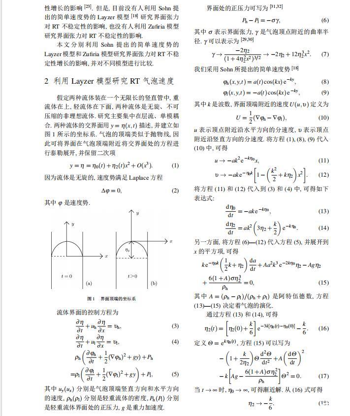本文分別利用Sohn提出的簡單速度勢的Layzer模型和Zufiria模型研究界面張力對(duì)RT不穩(wěn)定性增長的影響,并對(duì)不同模型進(jìn)行比較。