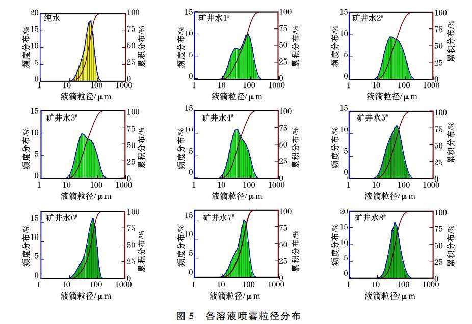 噴霧降塵效果與霧化特性參數(shù)密切相關(guān),其中霧滴粒徑是影響霧化特性的關(guān)鍵因素。9組溶液在15cm測點(diǎn)處的粒徑分布如圖5所示。由圖5可知,各溶液霧滴粒徑主要分布為25~75μm,純水、礦井水1#至4#和礦井水5#至8#噴霧粒徑位于該區(qū)間的平均比例分別為80.10%、55.87%、69.73%,礦井水1至8#的粒徑累積分布曲線斜率逐漸增加,這說明礦井水霧化效果不斷提升。由此可知,礦井水中Na+、K+離子濃度越低,霧滴粒徑分布越集中,其霧場更有利于呼吸性粉塵捕集。這是由于礦井水表面張力減小,霧滴破碎程度逐漸提高,致使霧滴細(xì)化且粒徑集中分布于25~75μm區(qū)間,這說明噴霧霧化特性隨表面張力減小不斷優(yōu)化,霧滴粒徑趨向均勻分布。綜上,礦井水中Na+、K+離子濃度差異改變其表面張力,從而影響噴霧粒徑分布、霧化百分比等特性。