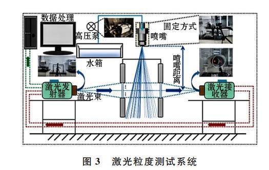 從圖3可知,噴霧粒徑測試主要儀器及工具包括激光粒度分析儀、高壓噴霧水泵、計(jì)算機(jī)分析控制系統(tǒng)等。計(jì)算機(jī)分析控制系統(tǒng)使用PAQXOS 4.1測量軟件,該軟件可定義、控制整個(gè)測量過程,并在試驗(yàn)結(jié)束后處理測量的粒度分布數(shù)據(jù)。