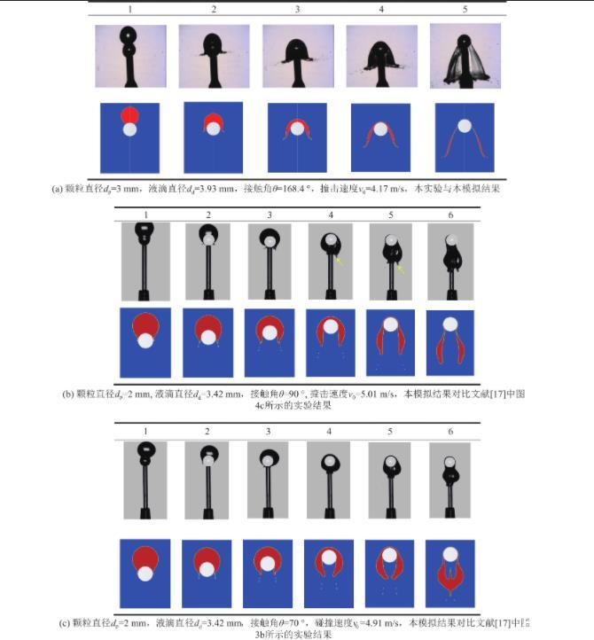 為進(jìn)一步驗(yàn)證本模型計(jì)算結(jié)果的可靠性,依據(jù)BANITABAEI等在實(shí)驗(yàn)中設(shè)置的不同碰撞條件,開展了相應(yīng)的數(shù)值模擬。如圖5b和圖5c所示,在不同碰撞條件下,數(shù)值模擬結(jié)果中的液滴形變過程與實(shí)驗(yàn)結(jié)果均具有較高的吻合度。圖6對(duì)比了數(shù)值模擬結(jié)果與實(shí)驗(yàn)結(jié)果中液滴幾何尺寸的變化過程,也具有較高的吻合度。其中,圖6a所展示的液膜底部直徑隨時(shí)間變化曲線,數(shù)值模擬結(jié)果與實(shí)驗(yàn)結(jié)果稍有偏差,原因是實(shí)驗(yàn)中固定顆粒的支撐柱對(duì)液膜底部的形變過程產(chǎn)生了一定影響。綜上所述,可認(rèn)為筆者構(gòu)建的數(shù)值模擬模型合理,結(jié)果具有較高可靠性。由于在毫米尺度下和微米尺度下,液滴與固體顆粒的碰撞過程均遵守經(jīng)典牛頓力學(xué)定律和經(jīng)典流體力學(xué)理論,所以本數(shù)值模擬模型可用于微米尺度下的其他工況條件的數(shù)值模擬研究。
