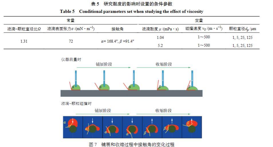 由于碰撞速度、粒徑和液滴黏度均會(huì)對(duì)液滴與顆粒的碰撞行為產(chǎn)生明顯影響,筆者針對(duì)這幾個(gè)因素設(shè)置了不同的數(shù)值模擬工況。具體工況參數(shù)見表5所示,其中液滴鋪展過程中的前進(jìn)接觸角為α;液滴收縮過程中的后退接觸角為β。利用數(shù)值模擬軟件的自動(dòng)保存功能,對(duì)碰撞行為發(fā)展過程中不同時(shí)刻的模擬數(shù)據(jù)進(jìn)行了保存。如圖7所示,當(dāng)液滴在顆粒表面鋪展時(shí),在迭代過程中將接觸角值設(shè)置為α。在液滴在顆粒表面的鋪展過程轉(zhuǎn)變?yōu)槭湛s過程的時(shí)刻,將接觸角數(shù)值由α改為β,再進(jìn)行后續(xù)的迭代計(jì)算。
