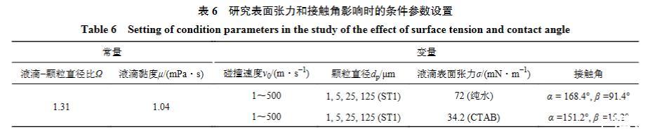 為了進(jìn)一步確定液滴潤(rùn)濕特性對(duì)液體附著比例的影響,筆者以碰撞速度、顆粒直徑和液滴表面張力(72 mN/m,34.2 mN/m)3個(gè)參數(shù)為自變量設(shè)置了不同的數(shù)值模擬條件,具體取值見表6。