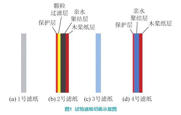 濾紙的切面結(jié)構(gòu)如圖1所示。1號(hào)濾紙為單層親水材料。2號(hào)濾紙由保護(hù)層a、顆粒過(guò)濾層b、親水聚結(jié)層c和木漿紙層d組成,木漿紙作為基層材料,c和d層、b與c層均由樹(shù)脂粘結(jié),a與b層通過(guò)超聲波焊接在一起。3號(hào)濾紙為聚四氟乙烯編織而成的單層網(wǎng)狀濾紙。4號(hào)濾紙由保護(hù)層a、疏水過(guò)濾層b和基層c組成,4號(hào)濾紙的粘結(jié)工藝與2號(hào)濾紙相同,保護(hù)層和疏水層由超聲波焊接在一起,基層和疏水層使用樹(shù)脂進(jìn)行粘結(jié)。