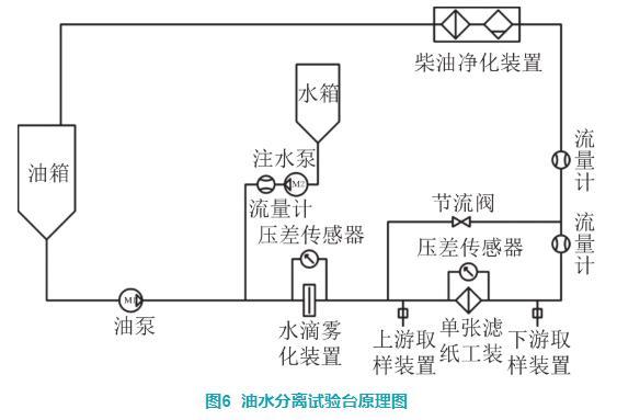 油水分離試驗(yàn)臺的原理如圖6所示。通過向水滴霧化裝置上游管路內(nèi)按質(zhì)量比0.15%的比例注水,油水混合物通過孔板裝置后柴油中的水會破散成更小的水滴,通過控制水滴霧化裝置兩端的壓差可以得到不同粒徑分布的水滴,調(diào)節(jié)壓差得到合適粒徑分布的水滴進(jìn)行油水分離效率試驗(yàn)。